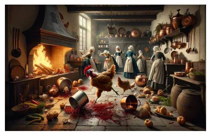 渐渐地,这破旧厨房被想象恢复了生趣:有了色彩、温度,甚至往昔的忙碌——人们进进出出,准备着贵族庆典盛大的晚餐。中世纪的人物们穿着那个时代的衣服,在这厨房里忙碌着。在人群中有一个年轻的女孩,大着肚子在搬一盆开水,想要为鸡鸭褪毛,可是那水盆没放稳,从灶台上被活鸡临死前的挣扎踹到了地上。